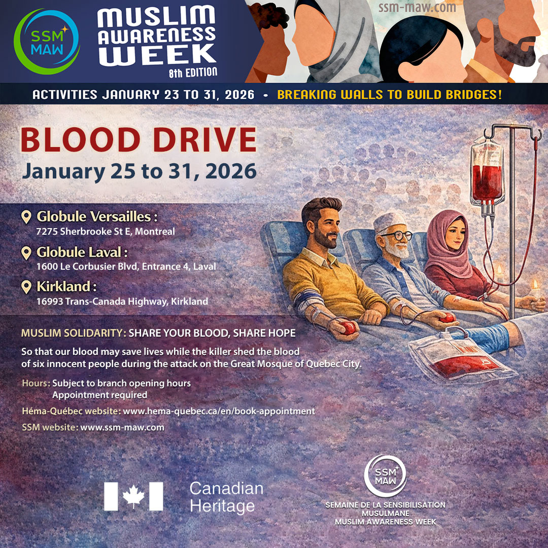 As part of Muslim Awareness Week 2026, SSM, in partnership with Héma‑Québec, is organizing a blood donation mobilization from January 25 to 31 at participating centers in Laval, Kirkland, and Globule Versailles.